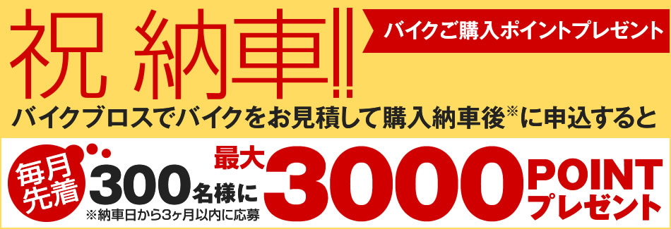 バイクのことならバイクブロス:トップ > キャンペーン情報 「祝 納車!バイクご購入ポイントプレゼント」